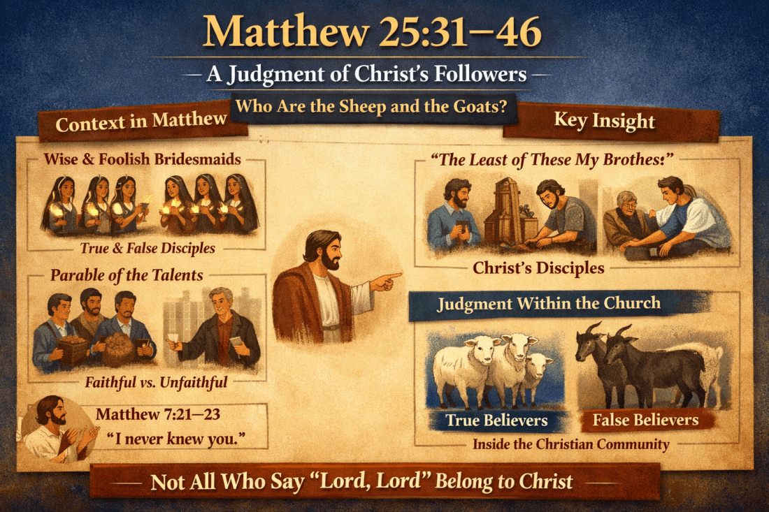 When the judgment scene of Matthew 25:31–46 is considered within the broader literary context of the Gospel of Matthew, it appears less likely that the passage is intended primarily as a description of the judgment of all humanity in general. Rather, the surrounding parables and Jesus’s earlier warnings about false disciples suggest that Matthew is addressing a persistent concern within the covenant community itself: the distinction between those who genuinely belong to Christ and those whose allegiance is only outward.