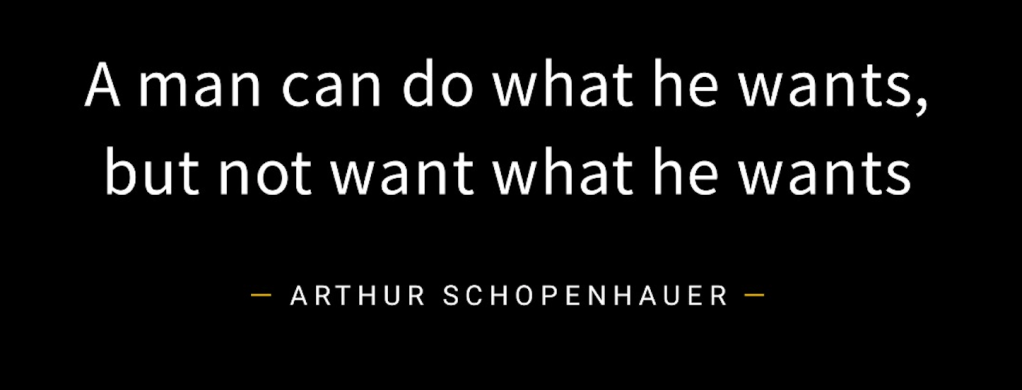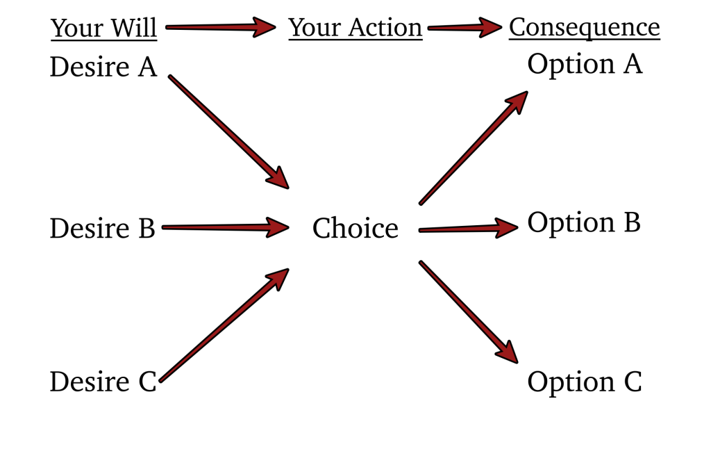 Looking at the diagram above, suppose you choose option A. There is a reason you chose A, and that reason was determined by one of the preceding desires. You don’t choose your desires, at least not in the moment of choice. You can shape your desires over time through ongoing actions, but in the immediate moment of choice your strongest desire will determine which option you chose.