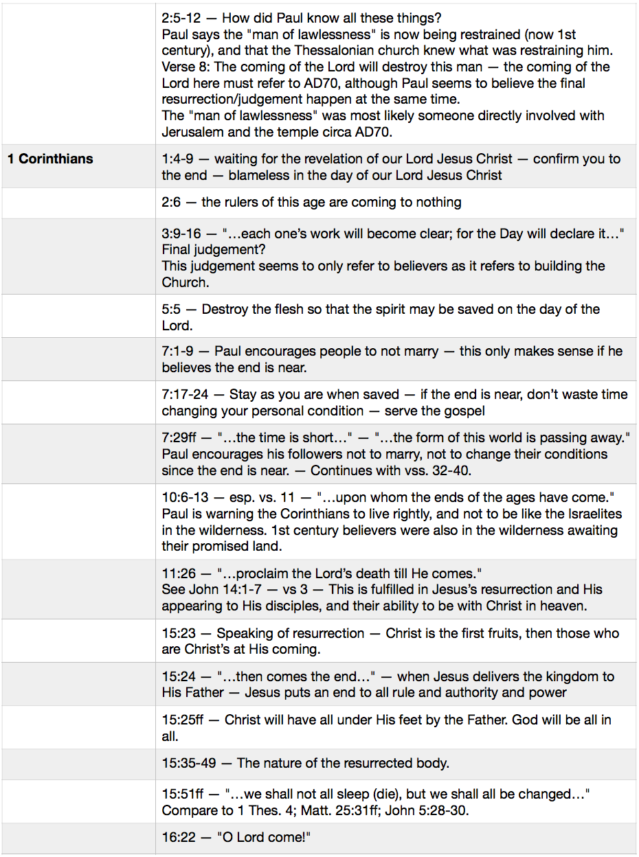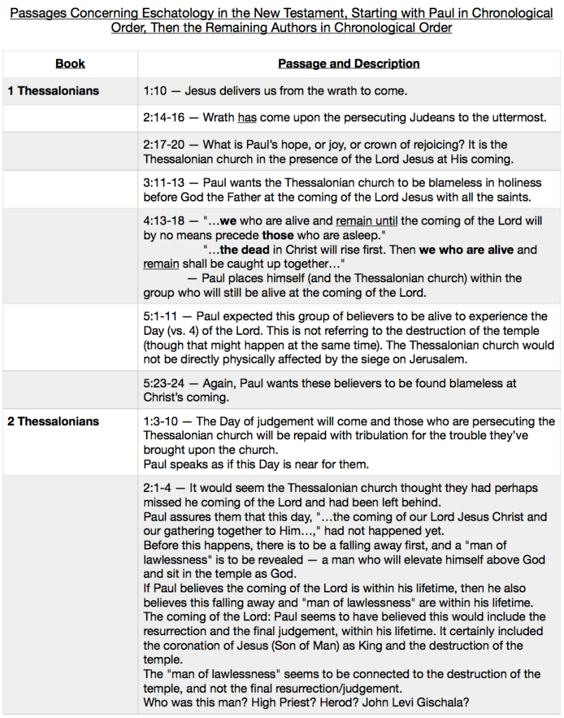 Below is a chart showing all the New Testament passages concerning eschatology. The passages are from Paul’s letters first, in chronological order, then through the other N.T. books, also in chronological order. I did not include any passages from Revelation as that entire book can be said to concern eschatology. I’ve added some brief notes as well….