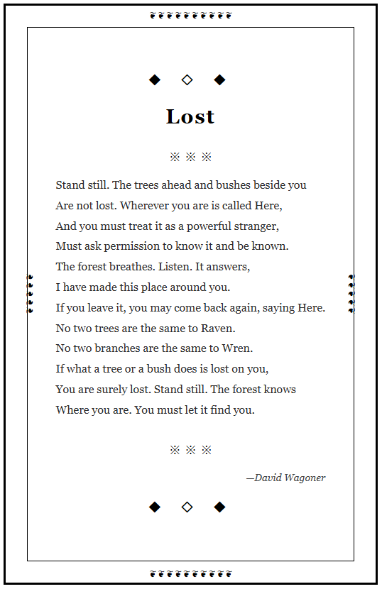 I think these two poems, Lost by David Wagoner and Into My Own by Robert Frost, compliment each other well…